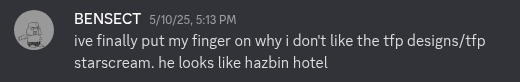 I have a lot of really strong emotions about Earthspark and complicated opinions. I really really liked the first season and got extremely emotionally attached to Earthspark Megatron. I thought his repaired friendship with Optimus and his relationship with the Terrans/Malto family and the whole thing about the Terrans being Transformer children adopted and fully accepted by a human family was really just so indulgently sweet and it made me feel feelings. I also really liked the first season's general focus on the fact that the war is over and the labels of Autobot and Decepticon are not binary descriptors of good vs. bad people and that there can be Decepticons who are sincerely trying to be good people. I really wish there had been more focus on how human society was adapting to Transformers living on Earth now that Cybertron was permanently inaccessible in the time that the original writing team had with the show. I have intentionally not watched any of the show past the end of season 1 because I didn't want to subject myself to it knowing that I would get upset but I have read the synopsis of what happens and I'm really disappointed and angry that they gave the show to an entirely different team who clearly didn't care about any of the themes and arcs the first season was trying to set up and just completely trashed everything about nuance and made it another bog standard "Decepticons are bad guys" story. The thing in season 4 about Megatron losing his memories and reverting back to being evil felt completely unnecessary and literally just like a final mean spirited "fuck you" to people who liked season 1. I will be reading a bunch of fanfic pretending everything after season 1 didn't happen because it really is that bad. It makes me feel ashamed to say I like Earthspark because people will think I mean the other seasons when I don't.TFP: